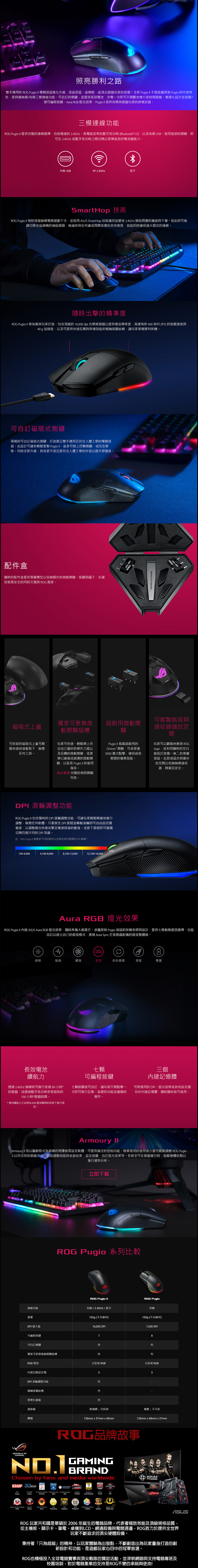 華碩 ASUS ROG PUGIO II 輕量無線三模RGB電競滑鼠 ● 最佳化三模連線包括雙無線 2.4GHz、藍牙低功耗 (BLE) 及有線 USB ● 領先業界的 16000 dpi、400 ips 光學感測器,可提供優異的效能 ● 雙手通用電競滑鼠具備 ...