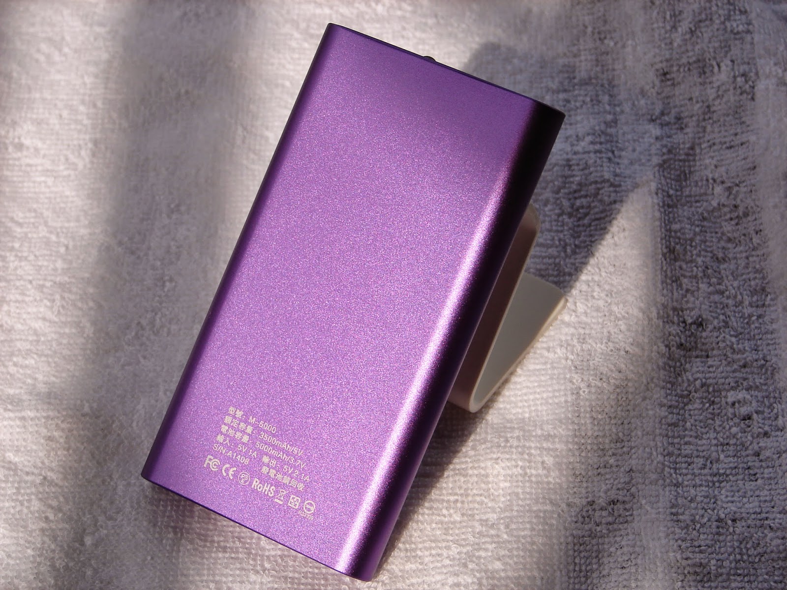 ▲ 本產品是紫色的金屬鋁合金外殼,並不在原本的藍、綠、紅、白、銀五色戰隊的範圍,所以本產品出品時是有六種以上的顏色的,電池容量為5000mAh/3.7V,額定容量3500mAh/5V,雖然挑選行動電源首重『電池芯容量』,但嚴格來說是要選擇較高的BSMI認證「額定容量」,這才是能真正充到目標裝置的真正電量。所以行動電源必須迫通過 BSMI認證並標示額定容量的原因。這樣一來各家廠商要灌水就不是那麼容易。額定容量3500mAh/5V對於智慧型手機可以充飽一兩次是沒有問題的,注意到最大輸出電壓可以到2.1A,這是可以對於iPAD等商品進行快速充電的,右下角包含了許多安規檢驗的標章!