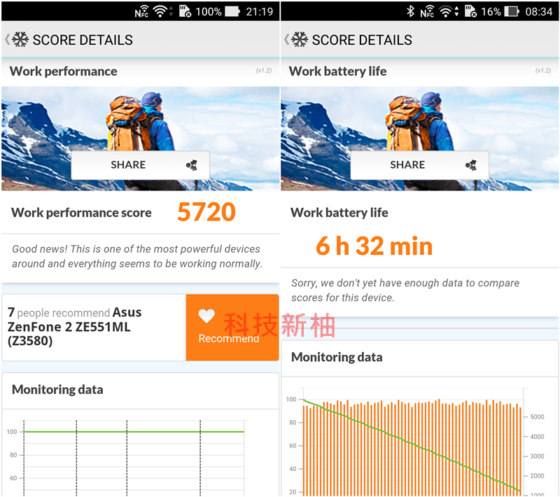 ▲ 使用 PCMark 分別測試日常工作效能與電池續航力,得到 5720 分 (圖左) 與 6 小時 32 分的成績 (圖右),電池續航測試環境為藍牙、NFC與無線網路全開,亮度設為一半。