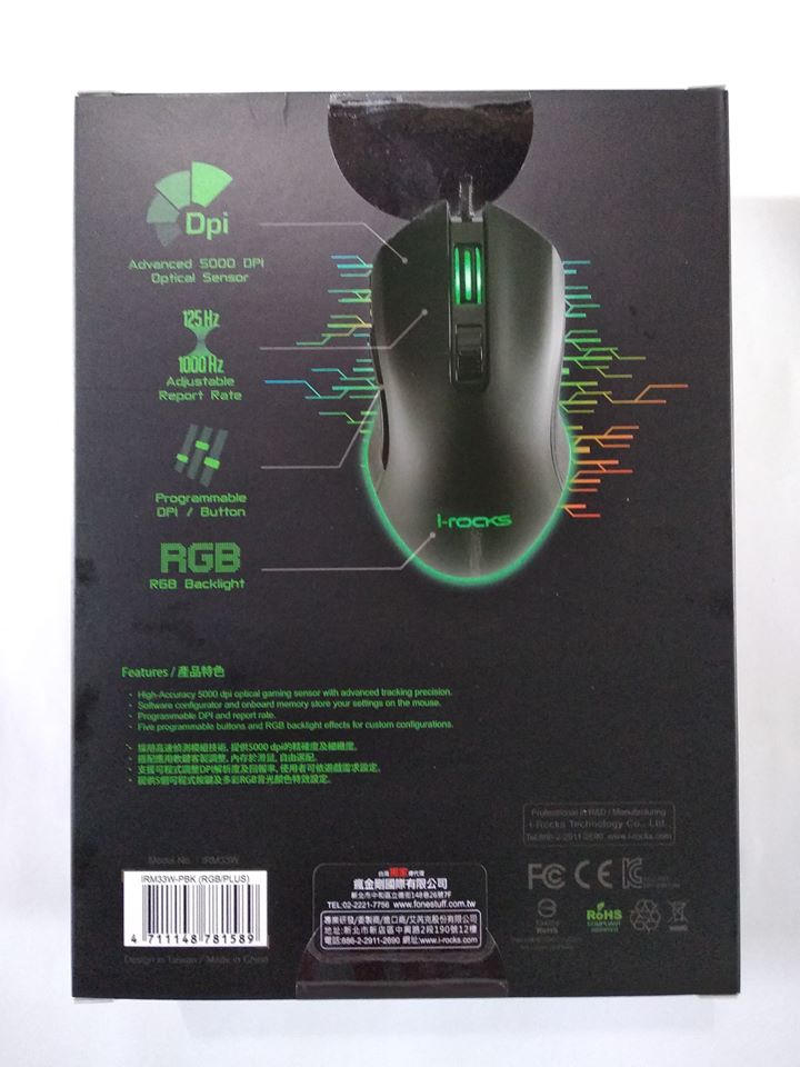 i-rocks M33 RGB多彩遊戲光學滑鼠彩盒背面。