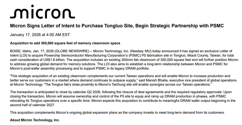 近日,美光(Micron)宣布已於 2026 年 1 月 17 日與力積電(PSM...