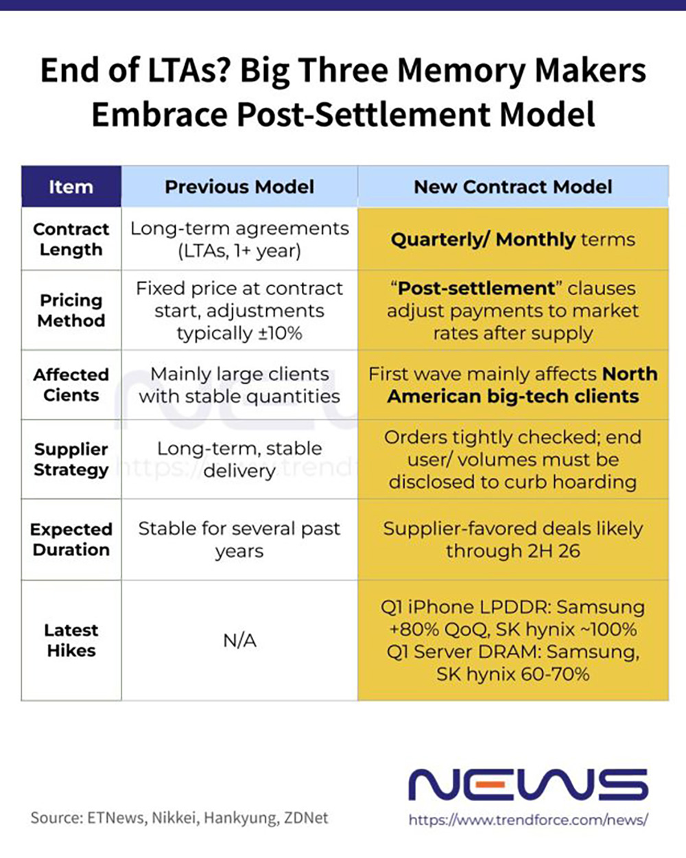 最近 DRAM 與 NAND 快閃記憶體供應短缺導致價格暴漲,使得三星 (Samsung)、SK 海力士 (SK Hynix)和 美光(Micron) 對簽訂長期供應協議(LTA)的意願降低;即便像蘋果這樣採購量大且需求穩定的指標性客戶,目前也只能逐季進行談判,而非過往半年度或年度的合約期限。