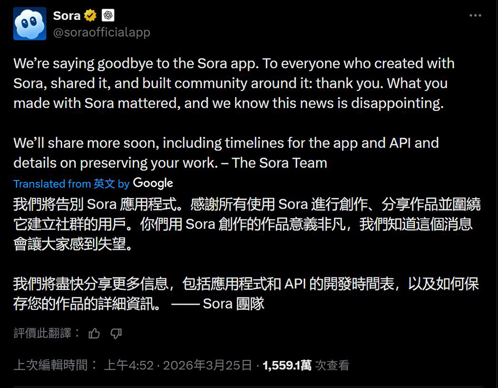 服務下線,包括 Sora iOS 應用程式、API 服務以及 Sora.com 官方網站都將停止營運。