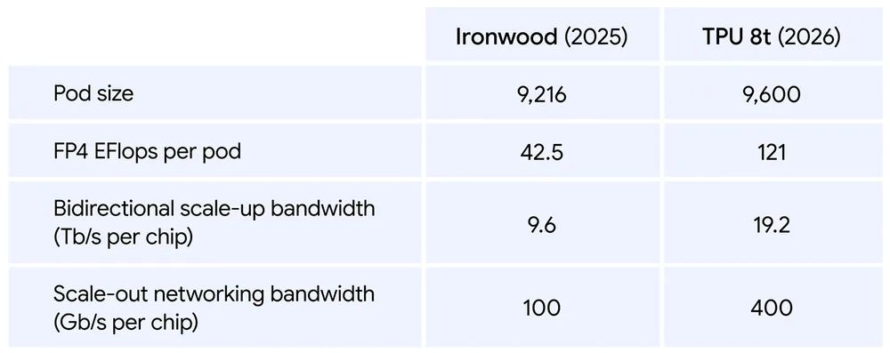 兩款產品均搭載第四代液冷技術,實現了傳統氣冷方案難以達到的效能密度。Google 預計 TPU 8t 與 TPU 8i 將於今年稍晚正式上市。